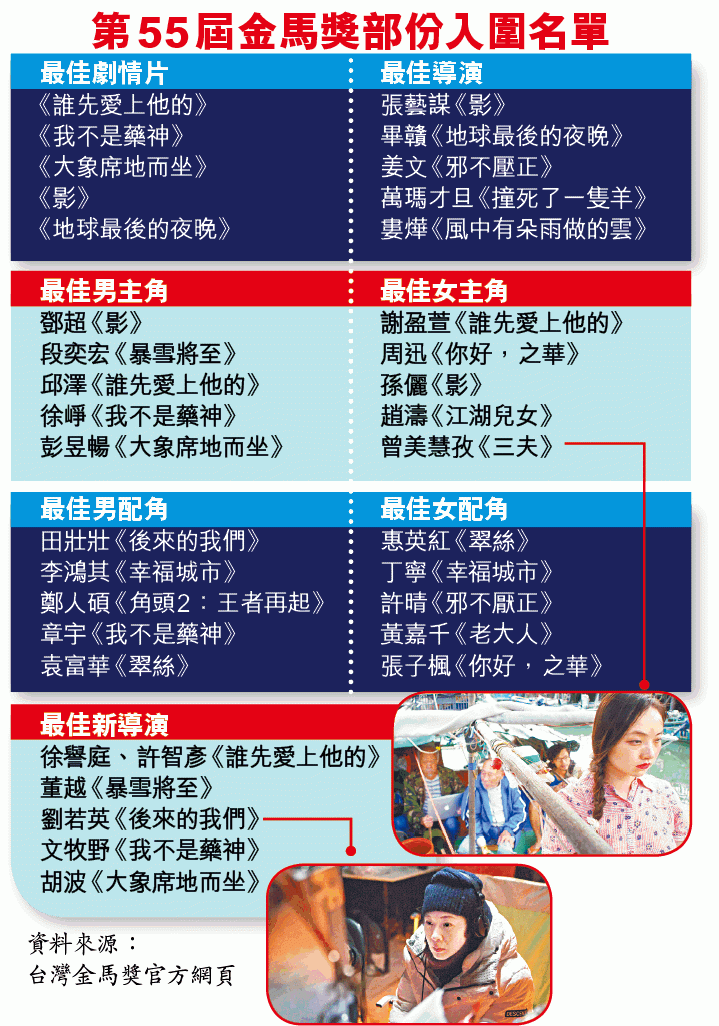 第55屆金馬獎下個月17日喺台灣舉行,噚日大會公佈入圍名單(詳見附表),今年共有667部影片報名角逐,比上年多出91部。張藝謀執導嘅《影》獲12項提名,成為最多提名影片,當中包括最佳劇情片、最佳導演等大獎,鄧超同老婆孫儷共同憑呢部戲入圍男、女主角,孫儷要同《你好,之華》嘅周迅爭獎。