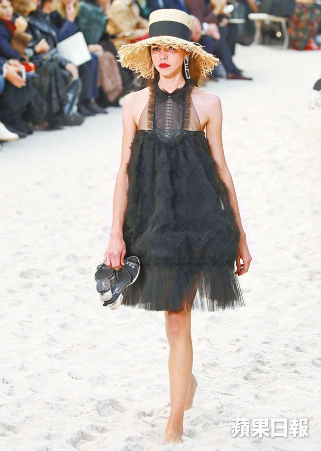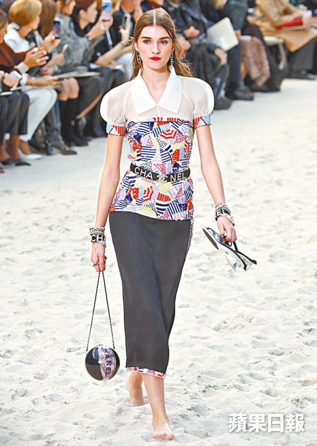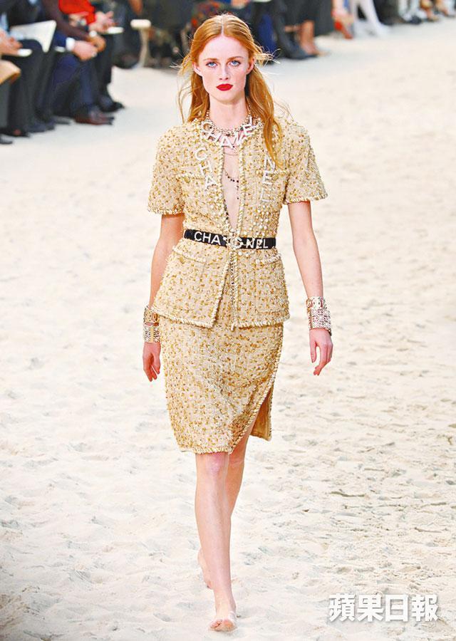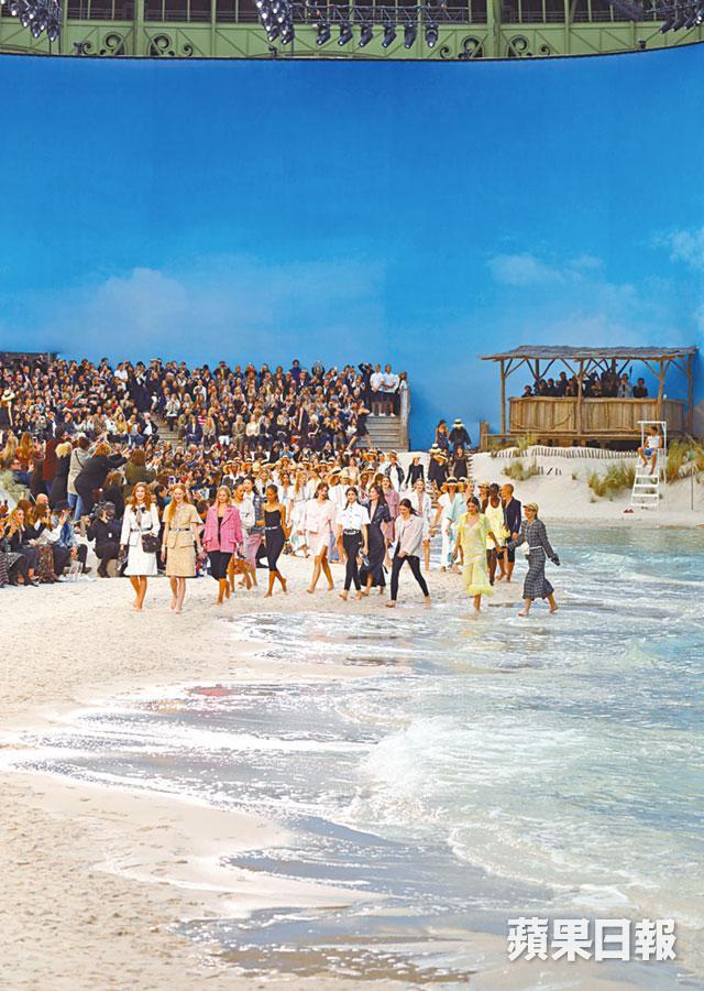 Chanel每季開騷都將巴黎大皇宮變身,今次帶大家去到熱帶風情的沙灘,伴隨人造海浪、沙灘椅,更有救生員當值,如像一趟沙灘派對,像真得有點瘋狂。配合夏日沙灘主題,模特兒全部赤腳踩沙行騷,沙灘傘變成服飾上玩味繽紛的印花,品牌簽名式的tweed依然是主角,剪裁刻意放寬。