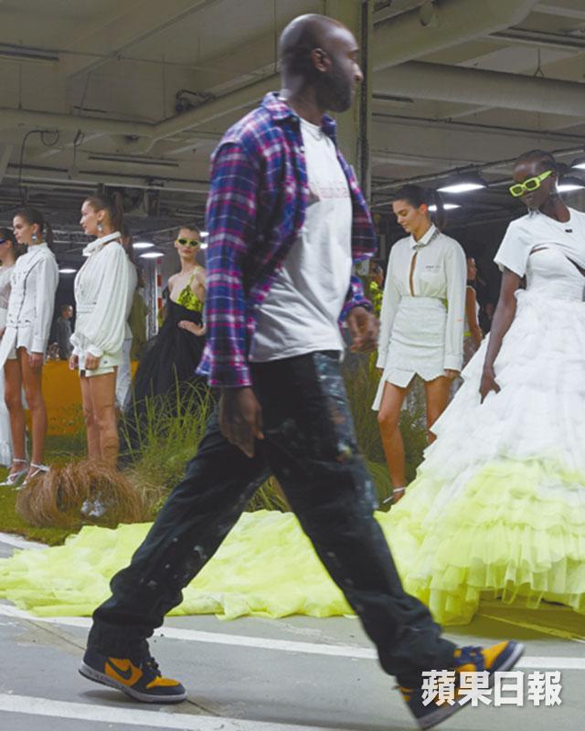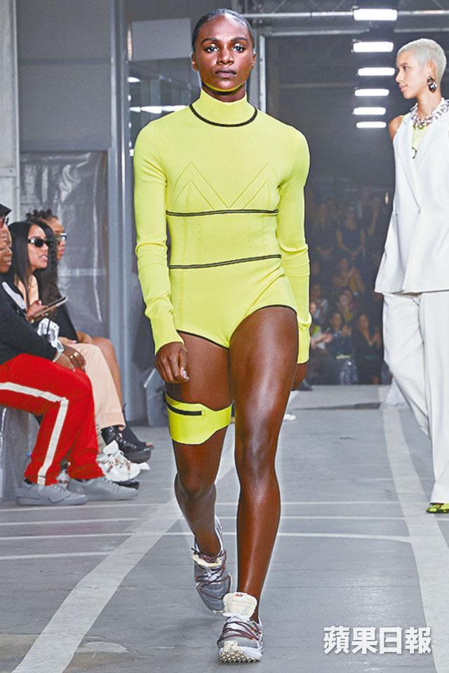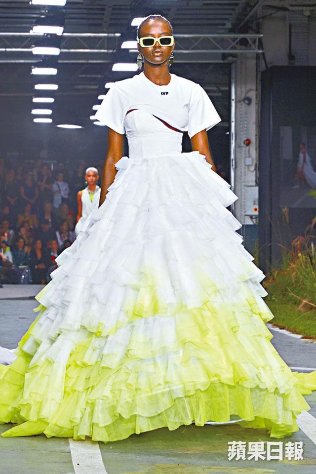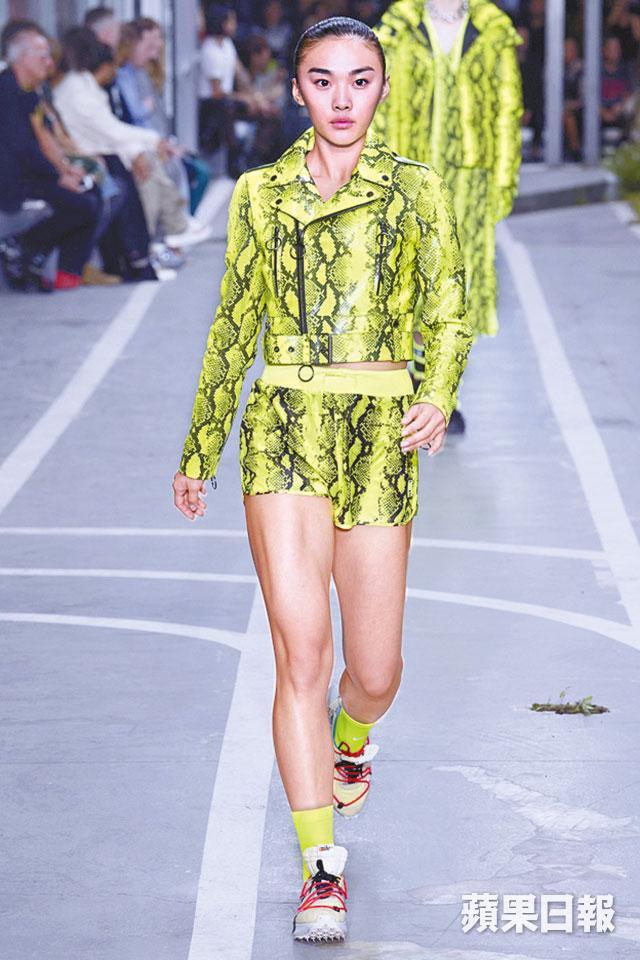 大紅人Virgil Abloh筆下的Off-White新裝,將女性化撞入運動世界中,激出新火花。依然與Nike合作,新系列以「Track & Field」為名,場地更佈置成運動場,氣氛滿滿,超模Bella、Kendall 以白色開胸裙打頭陣,接着一系列女人味的通花、蕾絲元素混搭在有Nike logo運動緊身衣上,而最奪目就是千層紗網裙,帶出優雅的運動風。主打print是螢光綠撞黑色蟒蛇紋,全印在皮革、不規則的風褸裙、迷你跑褲等,呈現時尚型格的sports style。