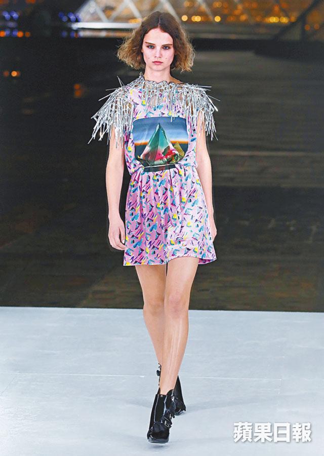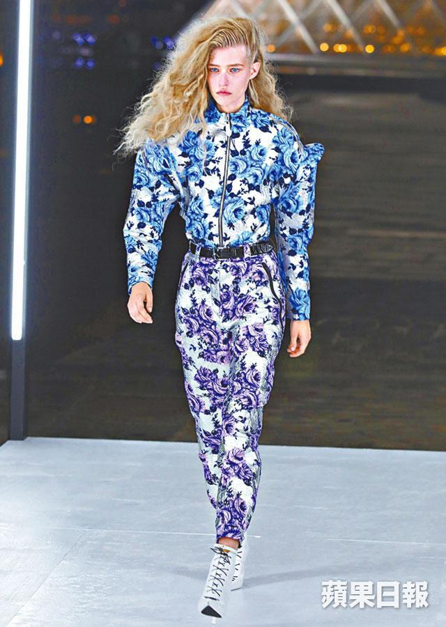 新季輪廓氣勢飛揚,剪裁比例刻意誇張,長身上衣的立體一圈圈細節,更令人聯想到太空衣。放大的泡泡袖貫穿系列,ruffle上身外披黑色背心,配搭色彩印花長褲,結合古典與現代。撞色色塊的設計,為乾淨利落造型更添未來時尚感。呼應未來主義,上衣的流蘇細節由金屬色打造;性感的平口小洋裝不對稱配上起角的肩線,一襲又一襲的網狀裙裝,更是衝擊視覺。