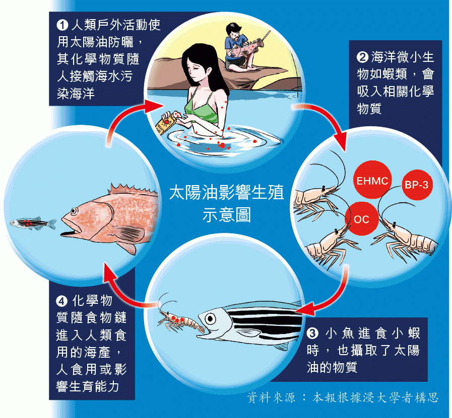 【本報訊】太陽毒辣,為了保護皮膚,不少人都會塗抹防曬霜,但防曬產品不會因卸妝而消失,殘餘物更會流入大海,成為污染海洋的「兇手」。香港浸會大學有研究發現,防曬產品中的化學成份「紫外線吸收劑」會對環境造成污染,研究員利用受污染水源進行實驗,發現若斑馬魚持續一段時間進食受到污染的豐年蝦後,產下的卵會「畸形」。斑馬魚跟人類基因高度相似,人類亦可能透過食用受污染的海鮮而影響生殖能力。研究亦發現有部份水產含有紫外線吸收劑。