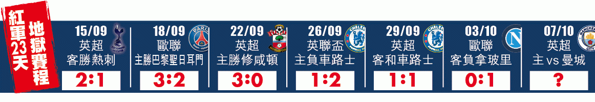 紅軍一連七場的「地獄賽程」,到下周日將進行最後亦是最難一關,英超榜首大戰迎戰曼城。
