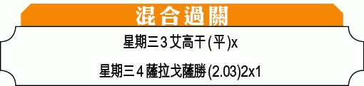 同日另一場開盤的西盃第三圈賽事,由盧高主場對艾高干;艾軍連同聯賽已七場不敗,防守力亦佳,開季至今只失兩球,相反盧高近況下滑,已三場不勝,「讓球」開出平手盤,當捧客軍。