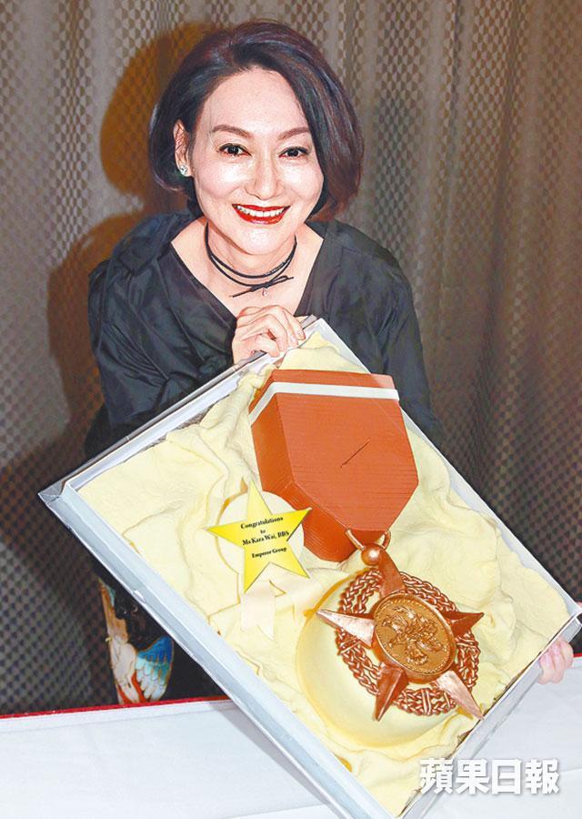惠英紅日前獲授銅紫荊星章,英皇老闆楊受成前晚在灣仔為她舉行慶功宴,惠英紅表示已將銅紫荊星章放在家中當眼位置,問她可要為銅紫荊星章買重保險?她認真地說:「原來呢個獎唔見咗要報警,冇得重發。」