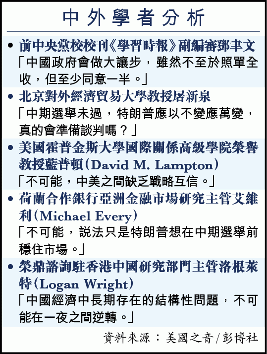 中外學者對中美貿易停戰的消息似乎並不相信。荷蘭合作銀行首席亞洲金融市場研究員Michael Every說:「我不相信這個故事!」他認為特朗普只是為了中期選舉才放風,若協議日後出現問題,便將問題推給中國。北京對外經濟貿易大學教授屠新泉亦懷疑消息真確,他認為特朗普最好的行動就是不行動,等待中期選舉,現時的消息太早。