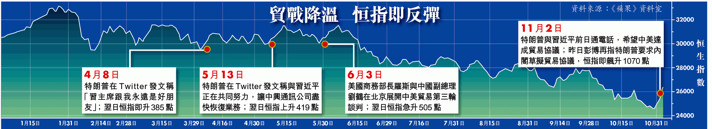 【本報訊】中美貿易戰正式開打4個月,美國將在下周二迎來中期選舉,總統特朗普前日突然與國家主席習近平通電話,美媒昨更傳出特朗普欲在G20峯會(二十國集團峯會)達成貿易協議,並草擬協議條款。貿易戰暫時降溫,受利好消息帶動,港股昨反彈飆升1,070點,創近10年最大升市,雖然有財經專家向《蘋果》指特朗普釋出和解訊號,但不少外國學者認為只是特朗普想在中期選舉前穩住市場。
