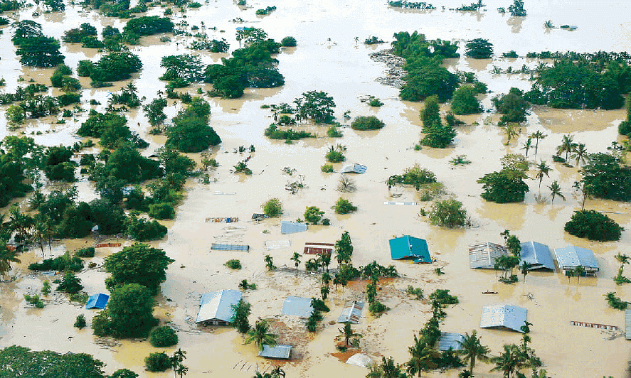以海邊小村欽達(Khindan)為例,全村淹成澤國,每天出屋就得捲起衣褲涉水。灘岸約十年前起被侵蝕,約佔沿海約兩公里範圍,五年間村中水井竟已被淹沒海中。村婦道米塔指着混凝土井口無奈說:「這原是村子的中心。」