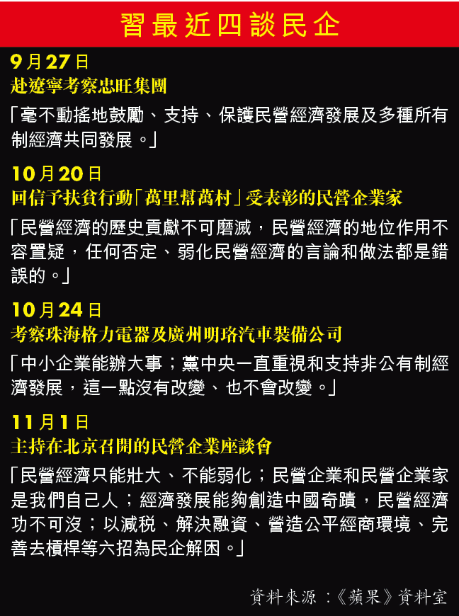 習又形容,民營企業和民營企業家是「我們自己人」,「任何否定、懷疑、動搖我國基本經濟制度的言行都不符合黨和國家方針政策,都不要聽、不要信。所有民營企業和民營企業家完全可以吃下定心丸」。