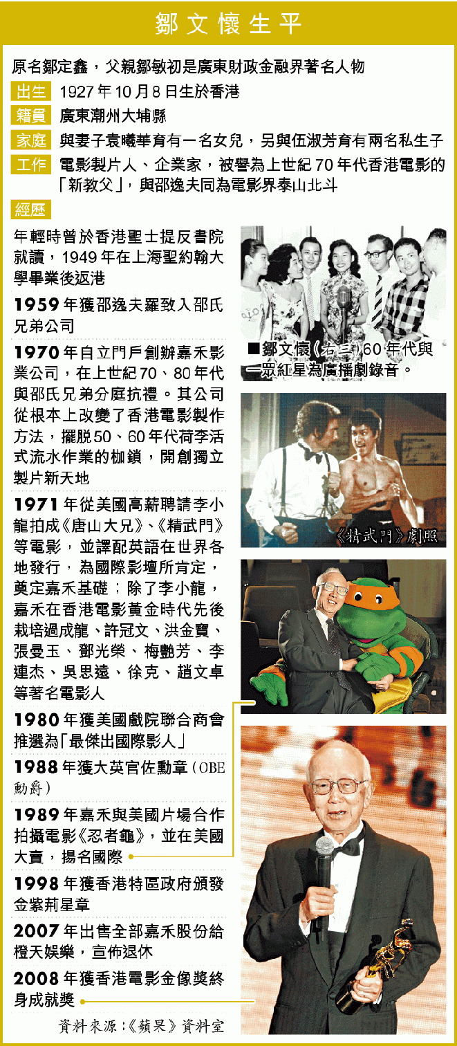 【本報訊】香港電影教父鄒文懷離世,享年91歲。鄒文懷一生致力香港電影業,把美國荷李活拍戲模式引入香港,又將香港電影帶到國際。影壇好友推崇他對電影工業貢獻良多,將國際巨星李小龍帶出世界更是驕人成就。曾效力鄒文懷嘉禾王國的劉德華銘記鄒的訓誨:「放任去追夢,但追夢時候可以丟了夢,別丟了自己。」