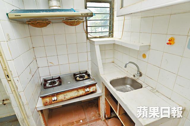 廚房牆身本來因為採用瓷磚,易於打理,相對乾淨,但煤氣爐銹迹處處,加上抽油煙機的「萬年油迹」,令其成為整個單位的「重災區」。至於旁邊的淋浴區,可謂毫無私隱可言,皆因旁邊是一扇大窗戶,面對商場及停車埸,無任何遮掩,相當「開放」,另相信因為長期受濕氣影響,導致熱水爐的上方有出現發霉的情況。
