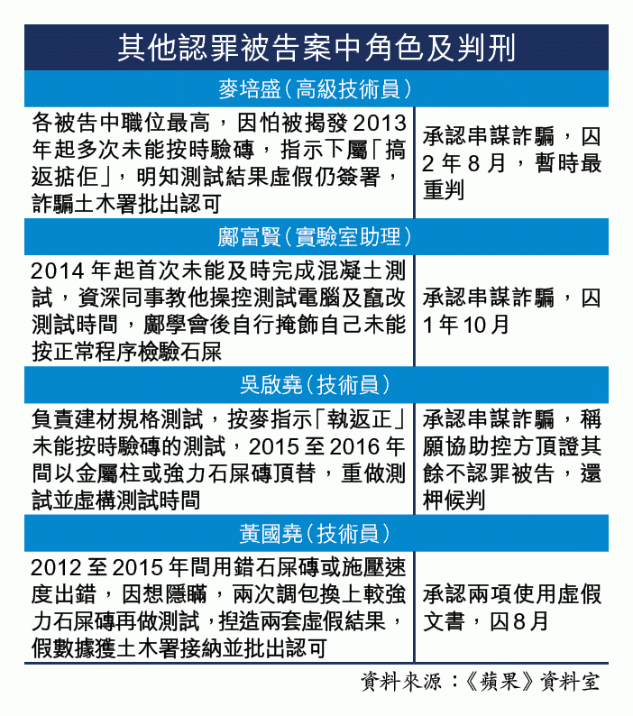27歲被告趙志興和26歲被告潘家偉昨在區院各承認一項串謀詐騙罪,兩人案發時均在土木署外判商嘉科工程顧問有限公司,任工地實驗室技術員。辯方求情指兩被告曾進行30多萬次測試,當中346次有問題,只造假約16至17次,並不算多。法官李慶年指政府要另花5,800多萬元作補救,直言造假一次都嫌多。