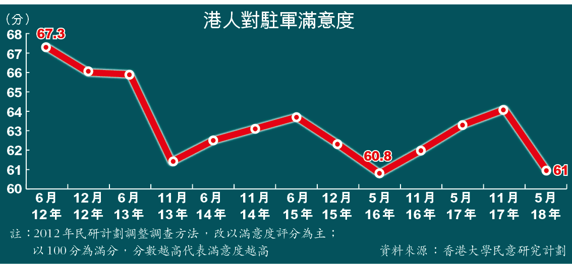 根據港大民研,駐港解放軍的民望有回落迹象,今年5月的最新調查顯示,受訪市民對解放軍的滿意度只有61分,是自2012年起的同類調查中,滿意度第二低,僅高於2016年5月的60.8分。