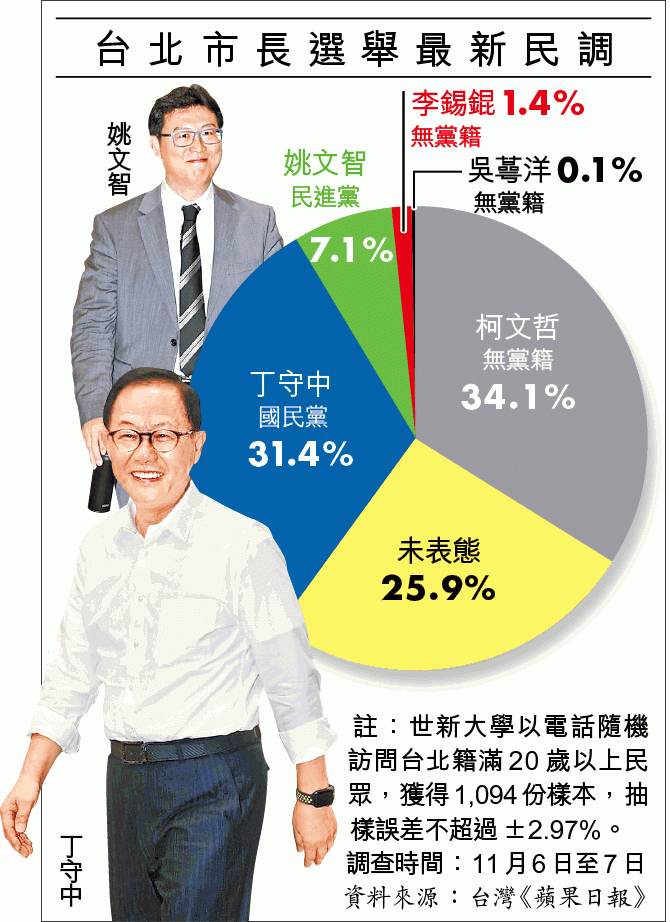 台灣《蘋果日報》委託世新大學作台北市長選舉民調結果顯示,34.1%受訪者支持柯文哲、31.4%撐丁守中、7.1%支持民進黨姚文智,未表態則有25.9%。比起9月,柯支持度下降0.8個百分點,丁支持度上升0.6百分點,兩人差距縮小至2.7個百分點,已在誤差範圍內(±2.97%)。四年前投給柯文哲的受訪者,則有57.2%表態繼續支持柯、10.1%轉投丁、14.9%轉向支持姚。