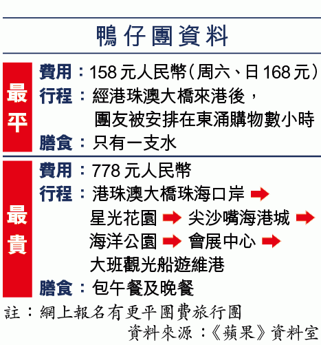 從珠海出發的「鴨仔團」,一般在港珠澳大橋珠海口岸集合。記者出發當日的早上8時,口岸已聚集近300人,該團在過關後,內地領隊才趕去買金巴車票,有團友亦感詫異,誤以為參加旅行團會由旅遊巴全程接送,領隊事後解釋,「如果係旅遊巴,就唔係呢個價(團費),仲貴呀。」