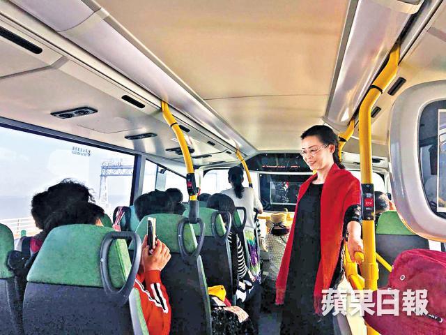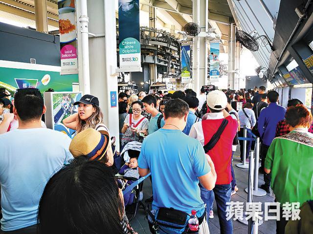 雖沒有私人旅遊巴,但45分鐘的金巴車程,不少團友亦表現興奮,紛紛舉機拍照,在巴士上層「留倩影」。抵達香港口岸下車後,領隊揮動黃色小旗帶領團友入境,然後乘坐旅遊巴到東涌,車程只需約5分鐘便到達東涌昂坪360纜車站。上纜車前領隊首先着團友排隊等候取票,更煞有介事說要去找「香港導遊」取纜車票。