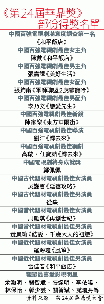 內地電視劇界盛事「第24屆華鼎獎中國百強電視劇」頒獎禮昨晚在香港亞洲國際博覽館舉行,頒獎禮是內地網民以演藝名人作評選對象,由一人一票在網上選出。主辦方自稱得獎者是「老百姓口碑」。昨晚紅地毯上星光熠熠,不少香港藝人如毛舜筠、溫碧霞、石修、孫佳君、林夏薇、張慧儀、郭少芸、陳家樂、何傲兒、張達明、謝雪心和楊思琦等都有現身撐場。