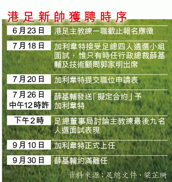 港足主教練加利韋特今年9月初履新,前任行政總裁薛基輔曾向傳媒稱,足總成立了四人遴選委員會負責招聘工作,成員包括他本人、足總技術及競技委員會主席王威信、足總主席梁孔德及技術顧問郭家明,薛當時指韋特的任命及有關條款均獲董事局支持。