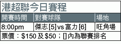 【本報訊】衞冕傑志今晚八時在旺角場上演的港超聯補賽,乘上輪8:1大勝凱景的餘威,出戰剛吃季內第二場敗仗的富力,力爭3連勝,以追趕東方龍獅及冠忠南區等聯賽榜前列球隊。