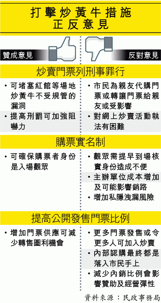 民政局表示,原則上不反對探討透過立法處理炒賣門票,包括修改《公眾娛樂場所條例》以涵蓋紅館及伊館在內的康文署場地,或修訂《公眾衞生及市政條例》,為康文署文娛中心售票訂立規例。