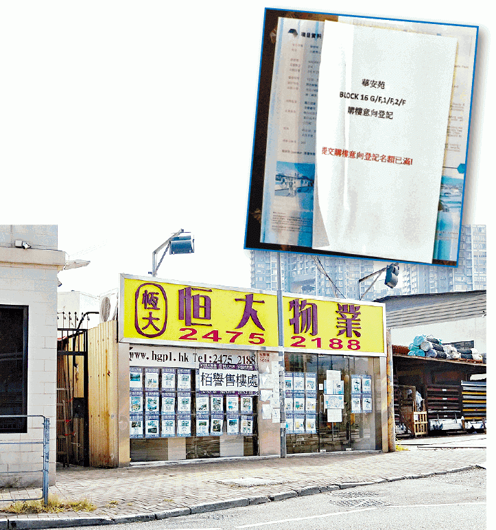 昨早九時五十分,記者在元朗大棠路恒大物業的售樓處現場,未見有任何準買家進入,而售樓處門口則張貼了「華安苑購樓意向登記名額已滿」的招紙。隨後,記者便進入店內,表明身份打算查詢時,惟經紀表示「不接受媒體訪問」,而店內僅見兩名老人家正在坐着。