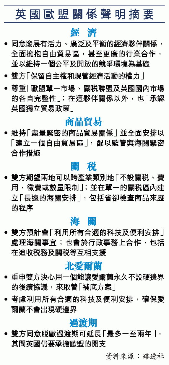 取得聲明草案的路透社報道,26頁文件內容涵蓋日後雙方在防務、司法、外交和執法上的合作,而在各方最關心的經濟關係上,英國和歐盟「同意發展有活力、廣泛且均衡的經濟夥伴關係,全面擁抱自由貿易區及更廣闊的行業合作……協議會確保一個公平競爭的環境」。草案又稱雙方會「尊重歐盟單一市場、歐洲關稅聯盟及英國內部市場的各自完整,承認跟歐盟的經濟夥伴關係外,英國有權發展獨立貿易政策」。