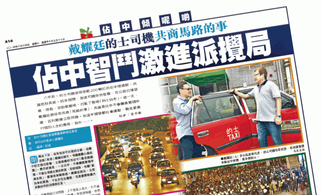 《星島》本月12日報道,訪問的士司機從業員總會秘書長黃大海,黃指該會2014年6月獲《蘋果》邀請,到報館「參加閉門座談會,商談佔中爭普選行動」,該會時任總幹事吳業培參與,發現與會者包括多名陸路運輸業代表,一名佔中搞手提出動員的士佔據中環主要幹道,會後吳獲邀與佔中搞手對談。上述報道其後被網媒「巴士的報」於本月14日及15日兩度引述,指《蘋果》「秘密商議叫的士司機大規模堵塞香港道路」、「不務正業,還帶頭去搞佔中」。
