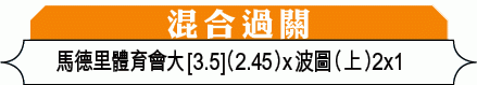 同日A組馬德里體育會主場對摩納哥,摩納哥已出局戰意成疑,加上馬體會火力強大,大敗或是最終結局,中位數[3.5球]直取「大」!(球賽編號:星期三2;有線643台明日1:55am直播)