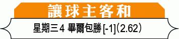 西班牙盃周三舉行32強首回合比賽,兩支西甲球隊對陣,由畢爾包主場迎戰侯爾斯卡;兩軍開季成績均欠理想,目前沉淪於聯賽下游,不過論實力,主隊擁有阿度里斯及蒙尼恩等好手,質素遠勝客軍,信畢包可大勝一場,先拔頭籌,「讓球主客和」[-1]熱捧「主勝」。