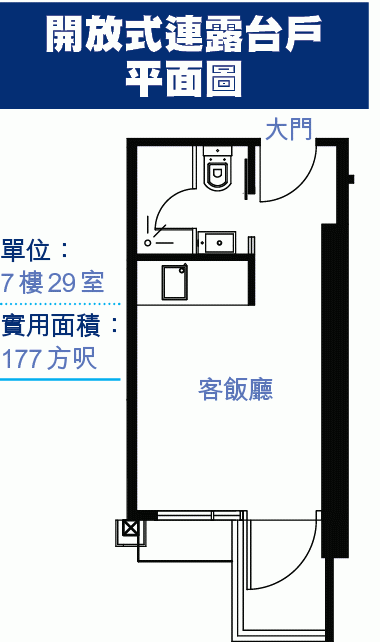 經本報實測,大小相當於6個3呎乘4.76呎,不包括洗手盆的廁格,連一條4.5呎闊乘9呎長的走廊,即14.3呎乘9呎,合共128.7呎。兩人在走動時容易有碰撞,一張雙人床已佔兩個廁格及大部份走廊位置,若計及開放式廚房及浴室後,所餘空間料只能擺放衣櫃。