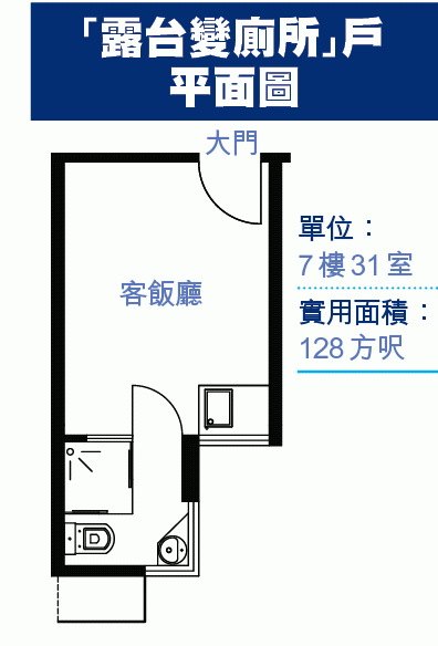 最受矚目的128方呎「龍床」劏房位於31室,全盤共12伙,採「廁所露台」設計,同層大部份單位設露台,但龍床劏房疑似將露台位改廁所,面積約24方呎,可用「麻雀雖小、五臟俱全」形容,提供坐廁、洗面盆及企缸。扣除廁所,實用面積只有約88呎,已包括客飯廳及開放式廚房。