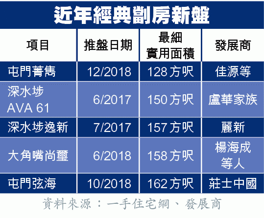 細數近年經典劏房盤,長實(1113)2014年推大埔嵐山1期,開放式戶最細只有177方呎,全港譁然,但之後2期更僅得165方呎,成為當時最細新盤。另外,麗新(488)去年7月推深水埗逸新,最細單位157方呎,入場費279萬元,呎價17,771元。盧華家族去年6月推深水埗AVA 61,最細150方呎,入場費達277萬元,呎價18,467元。