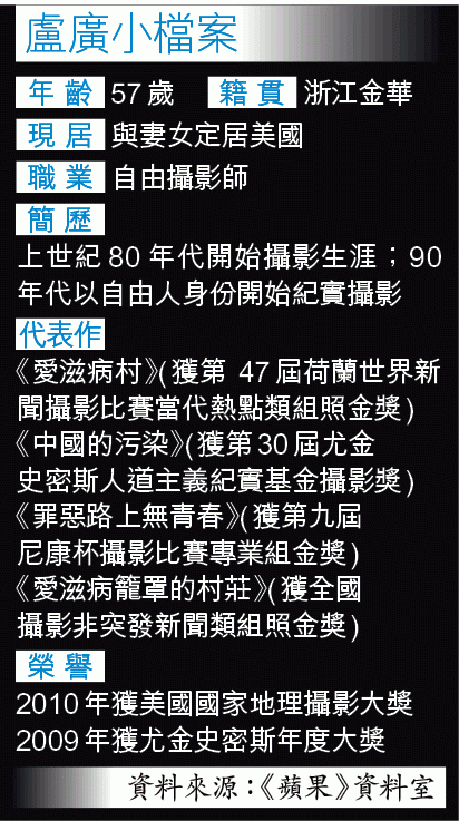徐透露,下周二(4日)是他們結婚20周年紀念,「自從和他失聯,我度日如年,只盼他們平安歸來」。消息引網民熱議,有人分析盧廣或踩中共當局紅線,去拍攝新疆的再教育營,中招被拘。近期新疆再教育營成國際關注焦點,盧廣身為關注社會問題的攝影家,加上向來以拍攝大膽題材著名,進入新疆被當局盯上不足為奇。本報昨致電徐,但電話未能接通。