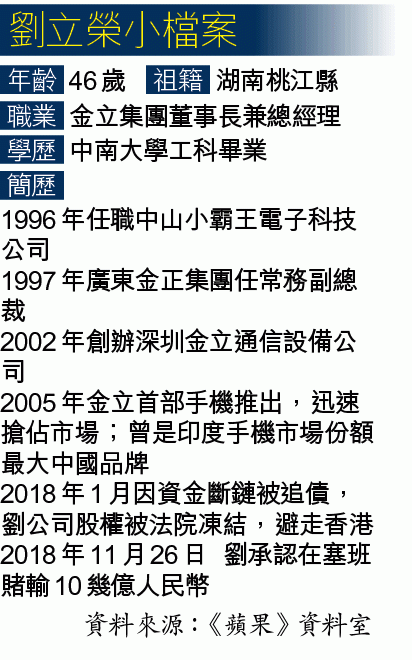 研究公司GFK數據顯示,去年智能手機品牌在中國銷售量中,金立排名第七,共售出1,494萬部,超越南韓三星1,107萬部。但劉立榮恐怕想不到風光過後,會被冠以「負債百億」、「裁員萬人」、「沉迷賭博」之名成為焦點。
