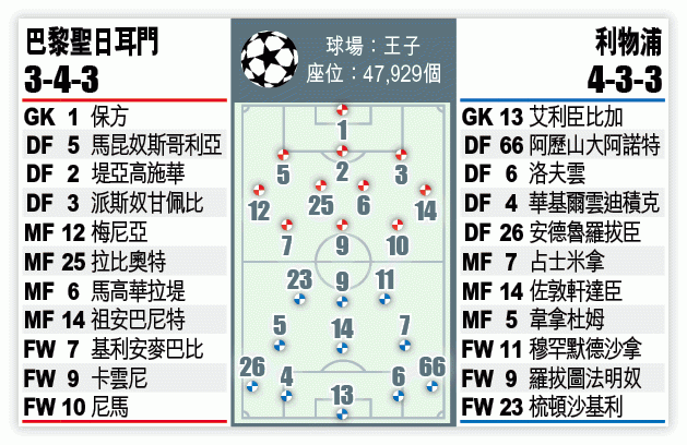 上輪法甲沒有兩人在陣下,PSG頓失霸氣,只能小勝圖盧茲一球,主場出擊但射門居然比對手更少,氣勢回落。雖說PSG橫掃法甲,但長期欠缺競爭,亦導致該隊在歐聯難發揮出高水平,在作客2:3不敵利物浦及主場2:2賽和拿玻里的賽事中,PSG均先失守,今仗隨時再被紅軍快馬如穆罕默德沙拿等施奇襲。