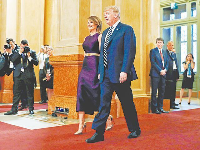 在官式晚宴及全體大合照場合,梅拉尼婭就以紫色無袖直筒裙示人,帶金屬感的紫調配鮮黃色的粗腰帶,用色對比大膽,相當突出,和她老公特朗普(Donald Trump)作風一樣,潛台詞是「我就是主角」,這條裙子出自美國女設計師Reem Acra。同場的彭麗媛則以亮麗的淺寶藍色晚裝出場,大方得體,領口及剪裁上保留中國風特色,略透光的紗質衣料,令造型添上新鮮感。阿瓦達就繼續揀選白色,穿上Javier Saiach訂製的喱士刺繡晚裝,一字領及中袖設計,高貴美麗。