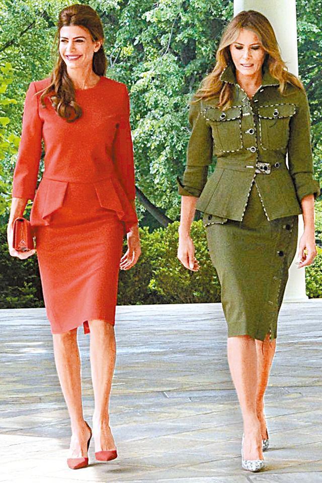 之後的活動,梅拉尼婭和阿瓦達再次過招,梅拉尼婭穿上Dior白裙,再女強人式披搭西裝,阿瓦達就巧妙地以綠色花裙以柔制剛。女主人要有不搶風頭的氣度,作客就另一回事。阿瓦達去年陪老公外訪美國白宮時穿紅裙,和梅拉尼婭的軍綠色,一紅一綠成為當時佳話。