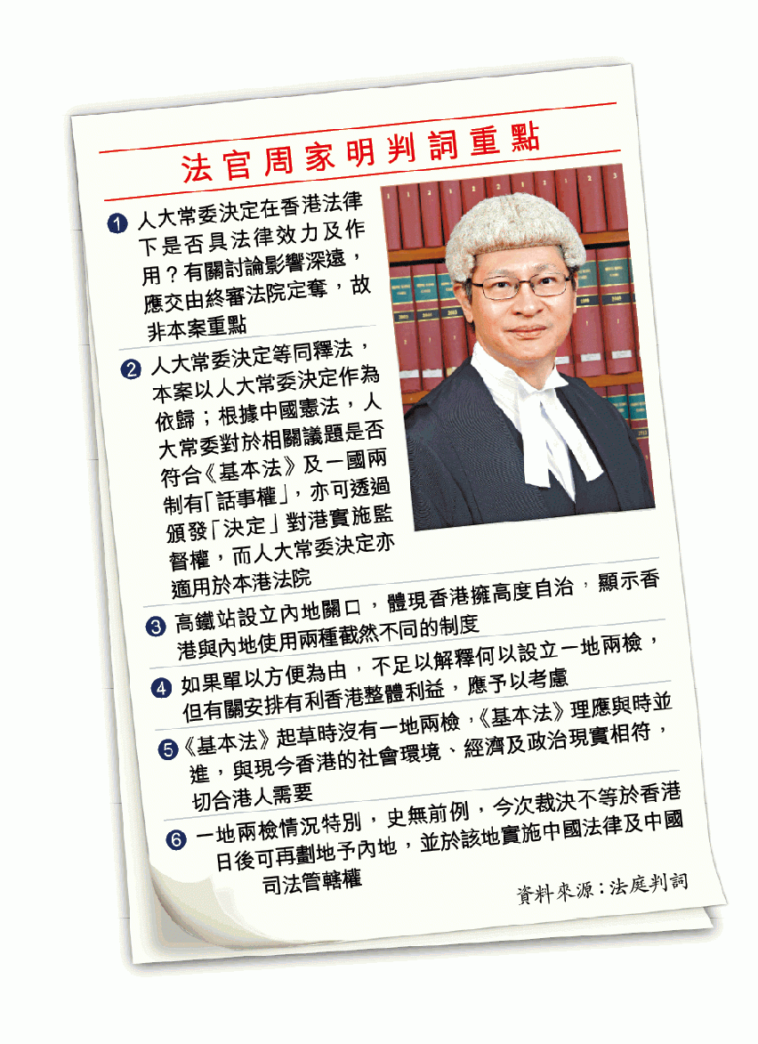 去年12月,人大常委通過「一地兩檢決定」,為高鐵西九站一地兩檢方案「一錘定音」。至今年6月,立會通過《廣深港高鐵(一地兩檢)條例草案》,之後郭卓堅及梁頌恆趕在高鐵通車前興訟,要求暫緩執行一地兩檢法例。惟周官拒批臨時禁制令,高鐵最終於9月23日通車。