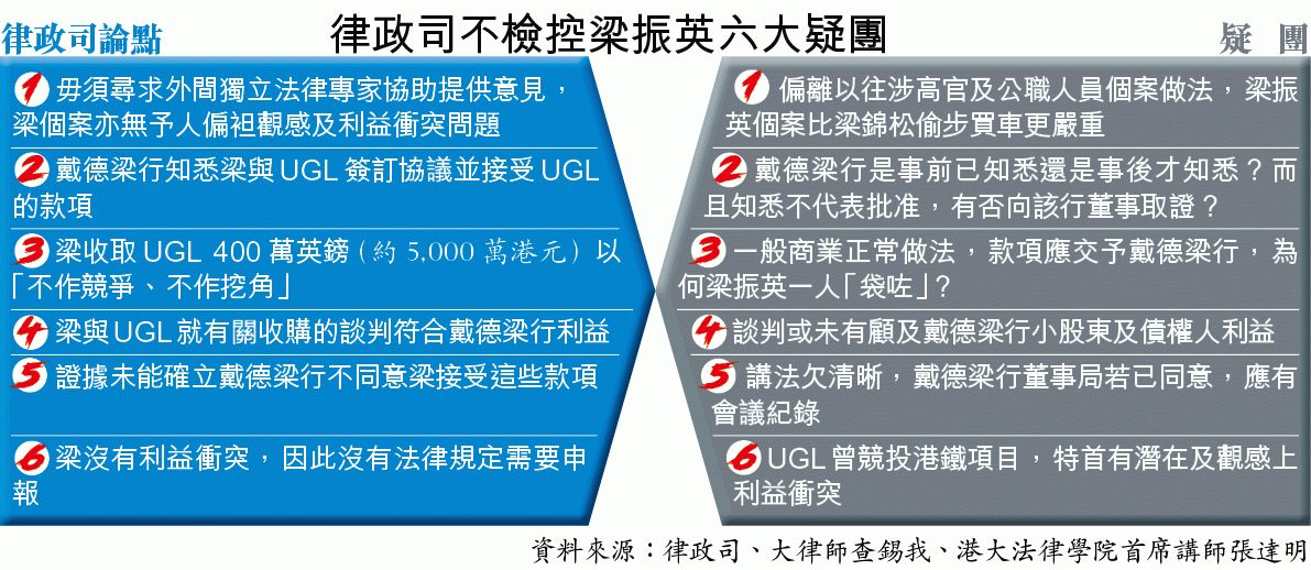 【本報訊】律政司前天發簡短聲明宣佈,就前特首梁振英收取UGL 5,000萬元而未有申報的指控,沒足夠證據提出檢控。律政司昨在傳媒追問下承認無尋求外間獨立法律意見,便自行決定不檢控。法律界及政界人士質疑,律政司對梁振英個案處理方式偏離慣常程序及法治精神,難令公眾信服不涉政治包庇。