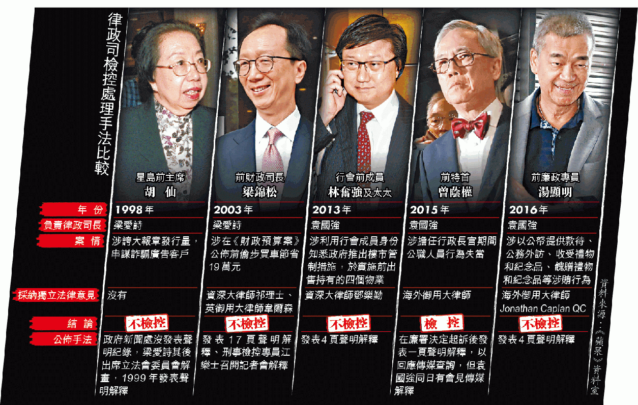 他舉例指,2003年時任律政司長梁愛詩決定不檢控財政司長梁錦松偷步買車避稅,聲明長達17頁紙,詳細羅列外聘本地及海外資深大律師意見,令公眾可看到並非政治原因或包庇。梁振英個案引起的公眾關注及質疑比梁錦松案更大,律政司聲明僅兩頁,只提結論並無法律分析,令人聯想到內地法院判詞,只會列出基本事實,然後跳到判決有罪或無罪,中間無解釋。律政司長鄭若驊的處理方法完全不符合基本法治要求,「一國兩制走晒樣」。