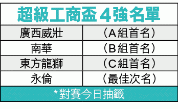 【本報訊】超級工商盃籃球賽昨晚假伊利沙伯體育館上演最後一輪分組賽,兩支仍要力爭出線的香港球會有不同遭遇,滿貫以63:78不敵廣西威壯,兩戰全敗出局;而永倫則以104:59勝馬來西亞國家隊,憑最佳次名出線四強。四強將會在周六上演,今日進行抽籤。