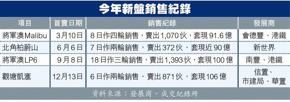 翻查資料,今年新盤票王會德豐(020)旗下將軍澳日出康城Malibu於3月時,8日作四輪銷售,賣出1,070伙,套現91.6億元。同區由南豐發展的LP6於9月時,18日作三輪銷售,賣出1,393伙,套現100億元。至於新盤首日吸金王、新世界(017)旗下北角柏蔚山,7日作兩輪銷售,賣出372伙,套現近90億元。是次凱滙於短短6日內已套現106億元,打破市場紀錄。