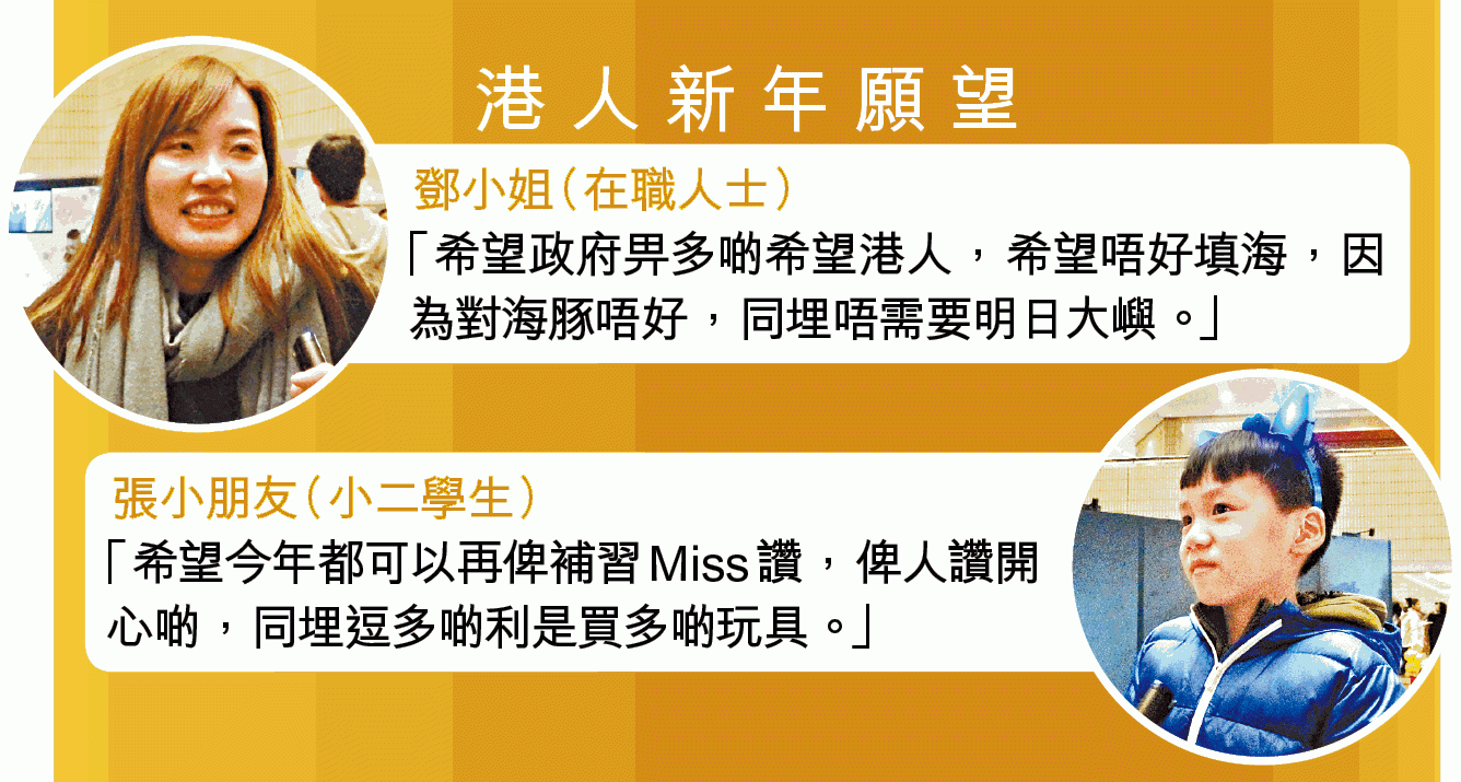 【本報訊】過去一年,香港劃上一道又一道的紅線,從禠奪候選人資格起、「割地兩檢」高鐵通車、香港民族黨被禁、再到馬凱、馬建、巴丟草事件,都顯示出香港自由逐步被收緊。踏入2019年,維港兩岸有大量市民觀賞煙花匯演迎接新一年來臨,每人都許下不同的新年願望。有市民希望政府能夠給予多些希望香港人,並直指不需要「明日大嶼」填海計劃。