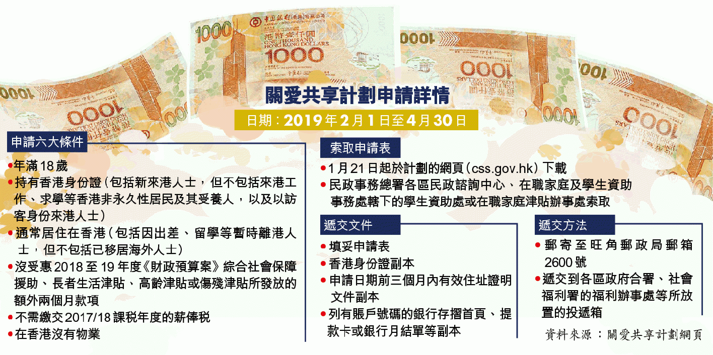 【本報訊】政府去年3月宣佈推出關愛共享計劃,為預算案補漏拾遺,選擇性向未能在預算案中受惠的市民派發4,000元,以及向退稅及差餉寬免少於4,000元的市民發放差額,但遲遲未交代具體細節。政府昨終於公佈,2月1日至4月30日接受申請,只要符合年滿18歲、通常居於香港、持有香港身份證、沒有繳交薪俸稅等條件,包括新來港人士亦可申請。政府發言人指整個計劃涉款約113億元,行政費佔約3億元,預計今年4月核准首批申請並發放款項。