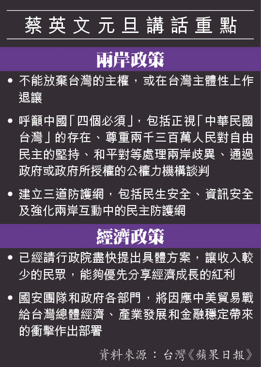 中國國家主席習近平今天出席《告台灣同胞書》發表40周年紀念會,料就其「新時代」兩岸政策作出重大宣示之際,台灣總統蔡英文昨發表上任以來首個元旦講話,狠批北京「若連豬瘟防疫都無法合作,哪來的兩岸一家親?」提出「四個必須」發展兩岸關係,強調必須由政府或政府授權的機構進行兩岸對話,要為兩岸交流建立「防護網」。有分析認為,蔡的宣示是為大陸與台灣縣巿的城際交流劃下底線。