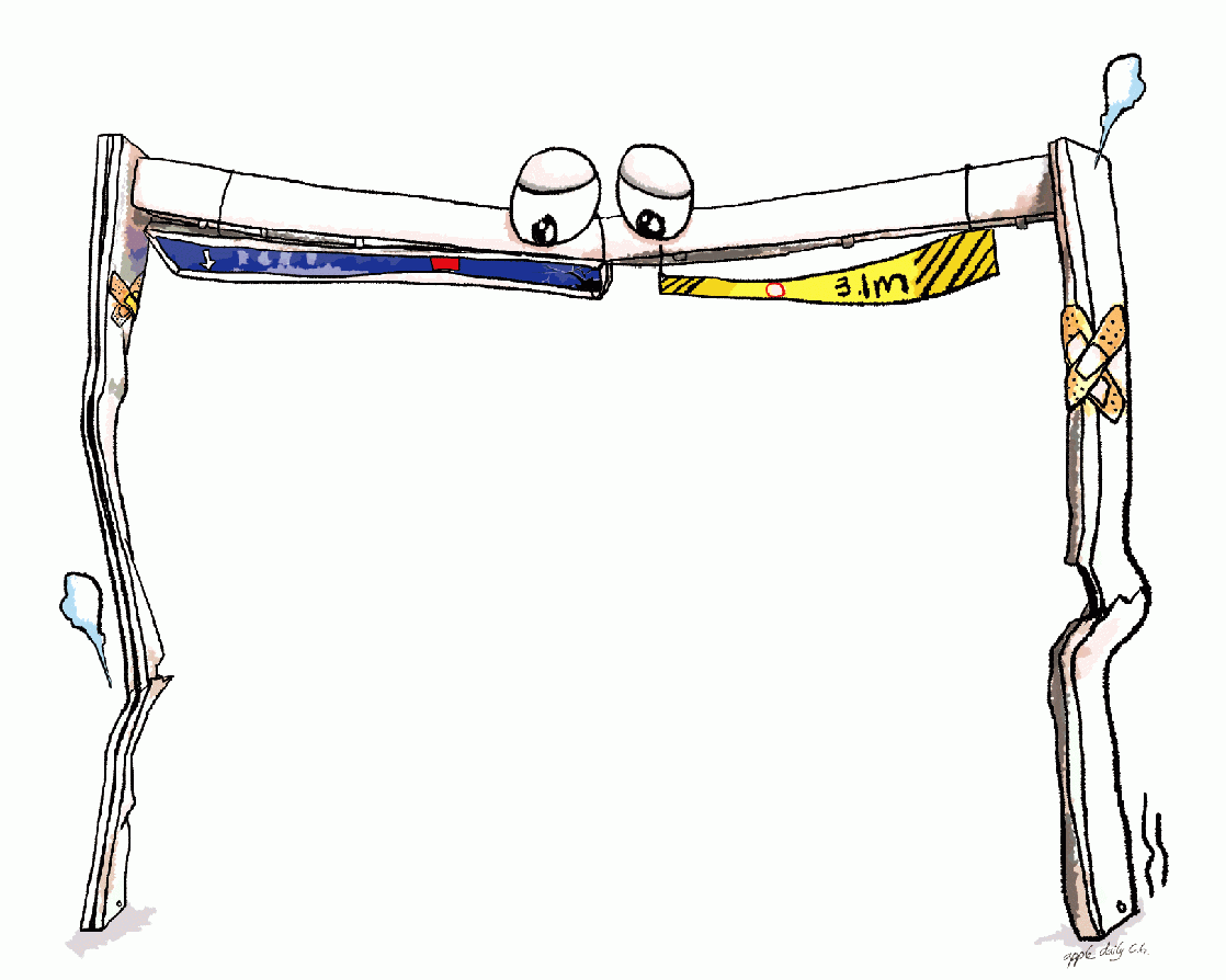 元旦清晨5點幾,讀者譚先生途經西九龍站對開,見到一架九巴撞咗埋限高牌,即係除夕撞車嗰個位置,好彩當時巴士上冇乘客,車長亦冇受傷,可自行倒車,但巴士上層車頭就嚴重變形,擋風玻璃亦爛晒。其實,現場只係限制3.1米車輛駛過,巴士一撞埋去就卡住。