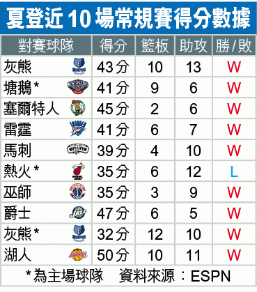 夏登今季表現可說是其生涯最出色的一季,上月球隊另一核心控衞基斯保羅(Chris Paul)拉傷腿筋需要休養至少兩周,他獨力擔起得分重任,至今已連續10仗攻入至少30分,近10戰共攻入408分,自近30年來繼拜恩(Kobe Bryant)及米高佐敦(Michael Jordan),第3位能在10場比賽中獲至少400分的球員。
