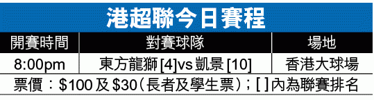 【本報訊】5場不勝的東方龍獅今晚8時在香港大球場上演的港超聯補賽,強攻榜尾的凱景,爭取新一年可以順利全取三分,並重返榜首。