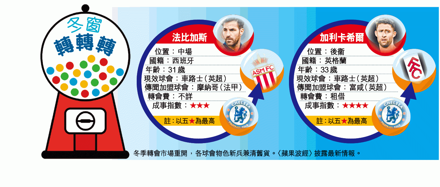 事實上,美國前國腳艾迪莊遜數日前已爆料,指相當期待普列錫與夏薩特合作,令外界確信交易快將落實。所謂有入必有出,車路士陣中兩名不受重用的法比加斯及加利卡希爾,很大機會在冬窗離隊。