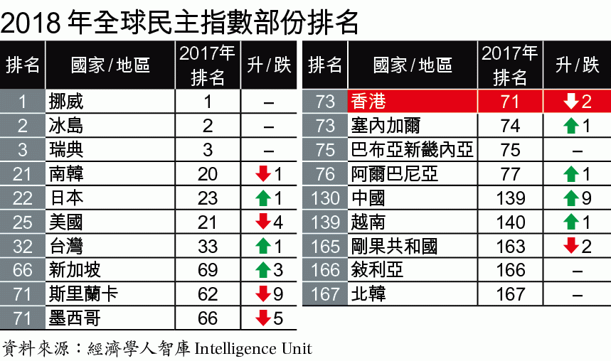 由《經濟學人》智庫Intelligence Unit(EIU)昨發表民主指數2018,頭五位依次為挪威、冰島、瑞典、新西蘭和丹麥,六至十位依次為加拿大、愛爾蘭、芬蘭、澳洲、瑞士。亞洲四小龍中,香港成為「包尾大幡」,排名第73。南韓排第21、台灣排名第32、新加坡排第66。