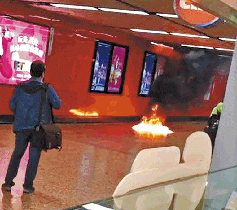 現場為港鐵旺角站近銀行中心E出口入閘機外的大堂位置,昨晨9時50分左右,大堂內有不少市民,突然地面燒起一團烈火,火舌及濃煙湧向天花,四周市民見狀大驚尖叫逃避。